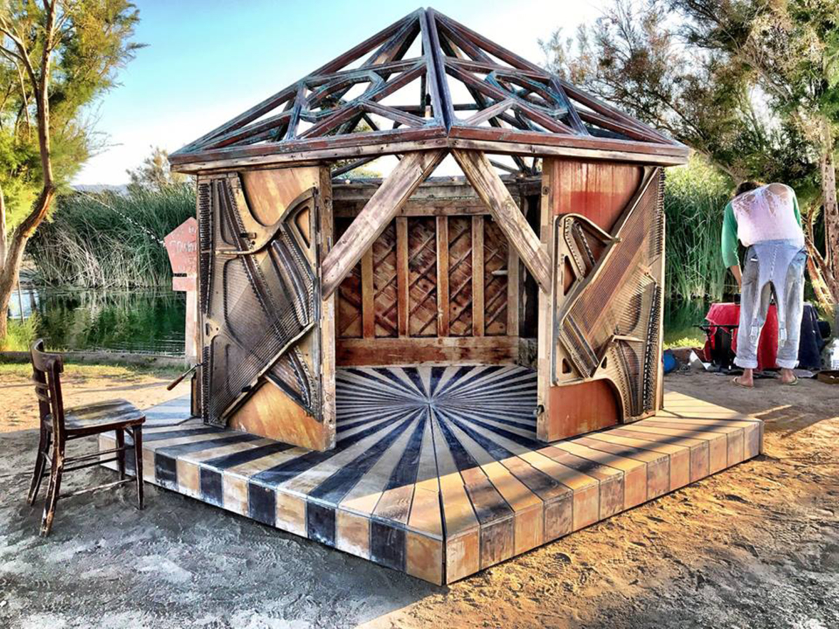 The 5 Elements Tea House is a Sound Cave shaped as a pentagonal gazebo built out of piano harps, musical strings, and exquisite wood working. With upwards of 10 piano harps and 2000+ musical strings, this musical sculpture is highly interactive for all to enjoy!